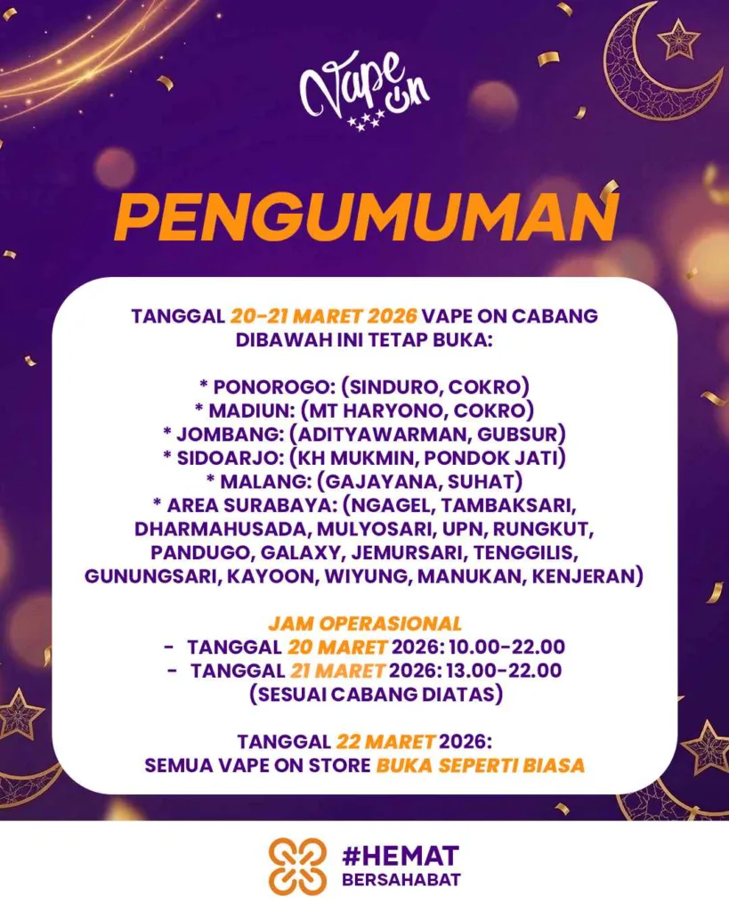 Lebih dari sekadar distributor, Vape On tumbuh bersama komunitas vapers Indonesia sejak 2016. Dengan semangat Hemat Bersahabat, kami berkomitmen menghadirkan produk berkualitas, harga kompetitif, dan layanan pelanggan yang selalu bisa diandalkan.